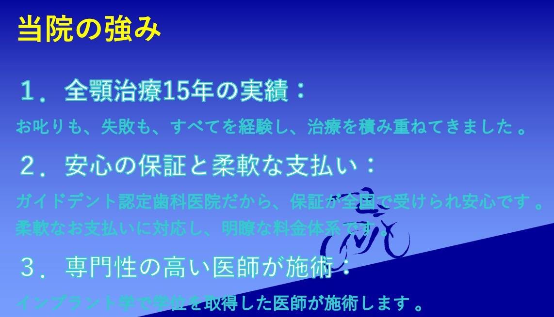 インプラント治療専門で 15年にわたり治療結果を蓄積してきた当院に、ぜひ一度当院の治療についての計画を聞きに来てください 。きっと解決できる糸口が見つかります 。