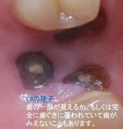 C4: 歯冠(歯の頭の部分)の大部分を失った状態